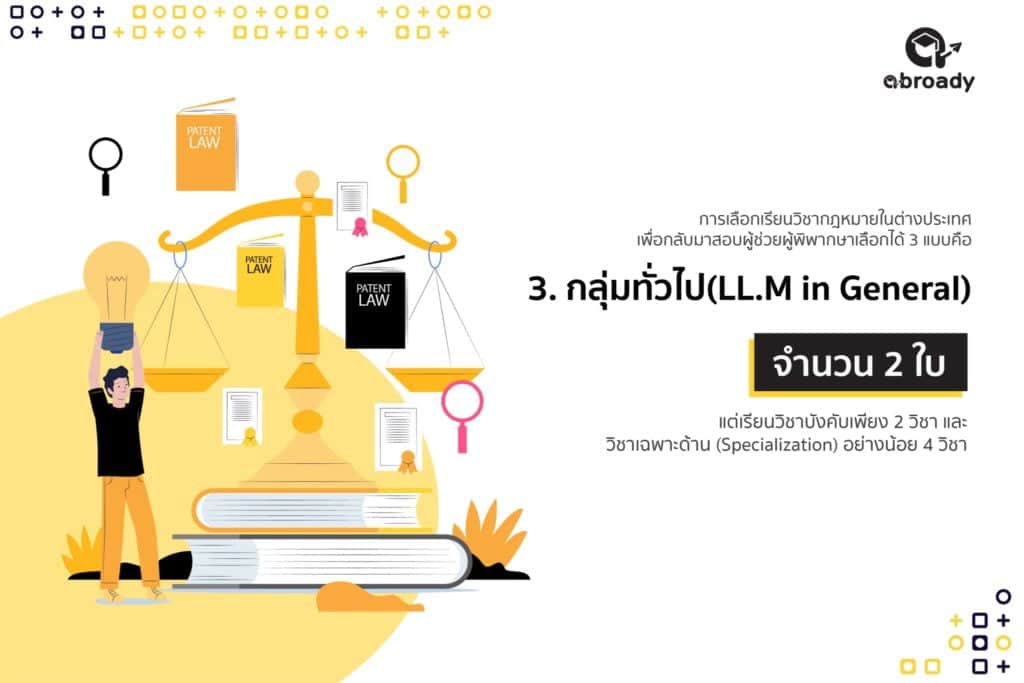 3. เลือกเรียนกลุ่มทั่วไป (LL.M in General) จำนวน 2 ใบแต่เรียนวิชาบังคับเพียง 2 วิชา + วิชาเฉพาะด้าน (Specialization) อย่างน้อย 4 วิชา